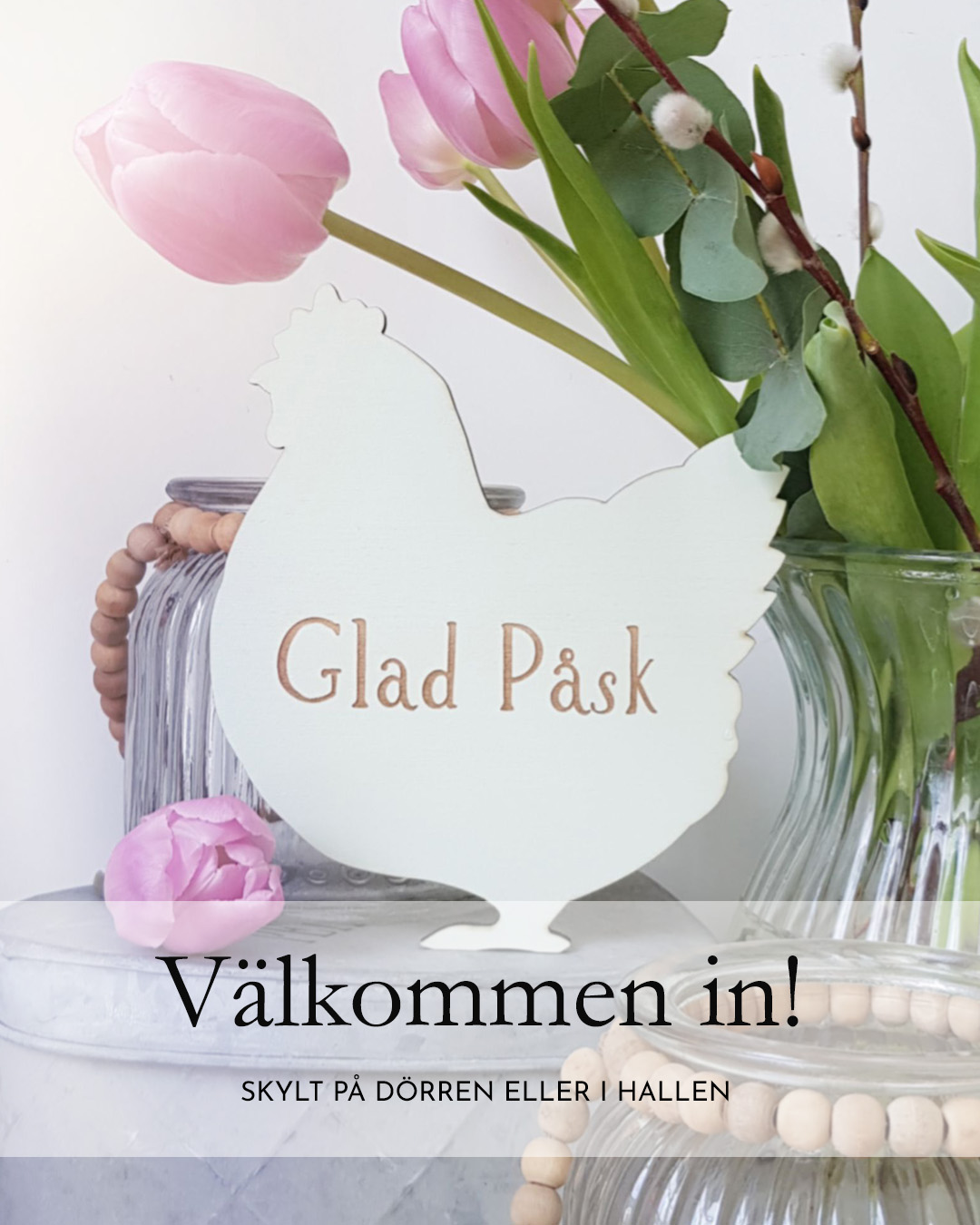 Entrén sätter ofta tonen för hela hemmet. En enkel dekoration på dörren eller i hallen kan räcka för att skapa lite påskkänsla direkt när man kommer hem. En höna eller tupp i trä, målad i mjuka pastellfärger som rosa, blått eller grönt, kan hängas på en krok i hallen eller på ytterdörren. Den kan också få stå i en kruka tillsammans med påskliljor eller krokus. Med en valfri text blir den både en dekoration och en liten personlig detalj i hemmet.