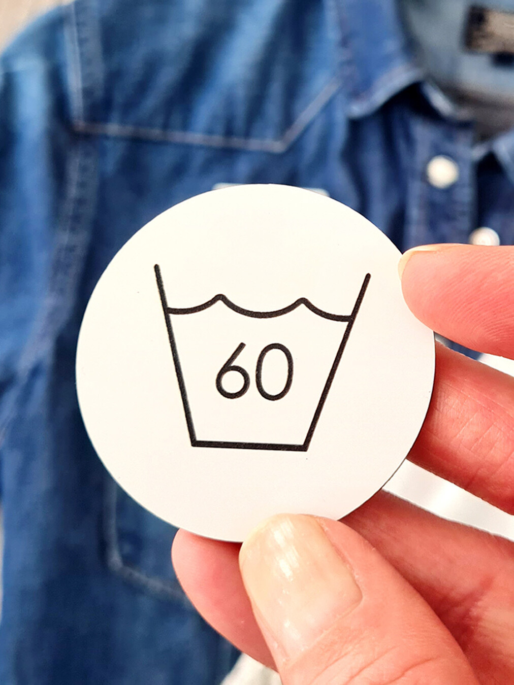 Alla skyltar har graverade tvättsymboler för hög tydlighet och finns med de vanligaste tvättråden: